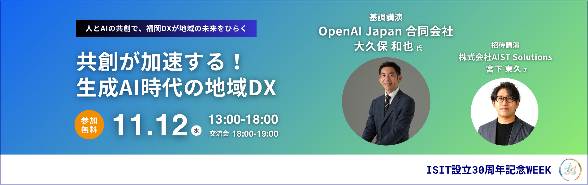 公益財団法人九州先端科学技術研究所(ISIT)の設立30周年を記念して、「ISIT設立30周年記念WEEK」を開催いたします。各部門による多彩なプログラムをご用意しておりますのでぜひご参加ください。