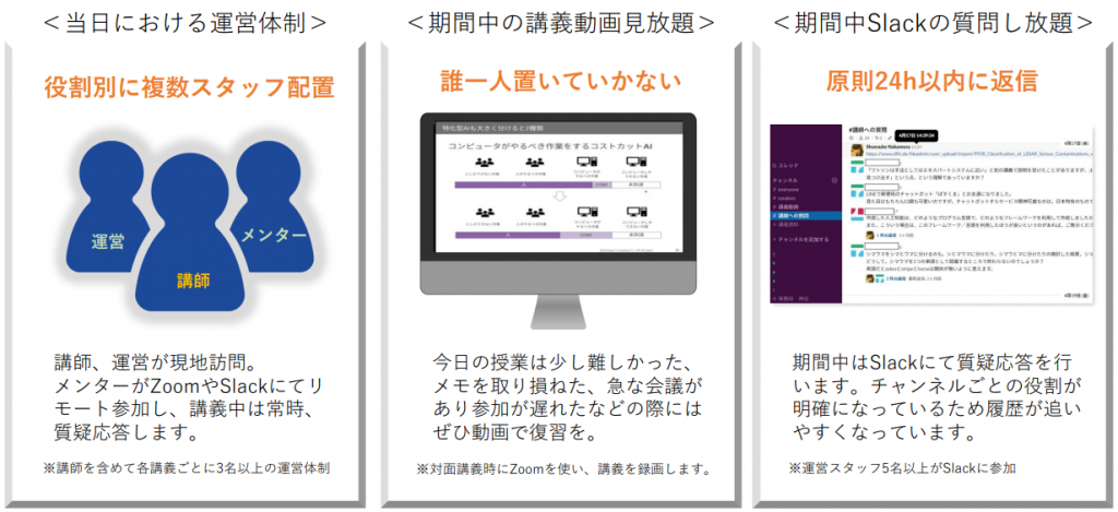 初心者の方がビジネス視点でAIを活用する知識を習得するコース、「G検定・E資格」取得を目指すコース、AIプロジェクトの設計方法や進め方を学ぶ実践的なコースなど、多くの企業・自治体で採用されている幅広い講座の運用実績がございます。