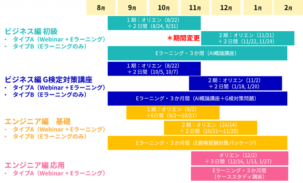 本スクールでは、今年度、ビジネス編とエンジニア編の2つの研修に、それぞれ日本ディープラーニング協会の最新のカリキュラムに準拠したG検定、E資格の取得を目指すことが可能なコースを開講します。