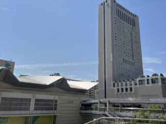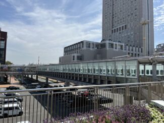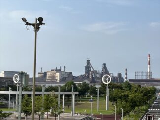 小倉駅の新幹線側のペデストリアンデッキ(高架型歩道)を、動く歩道に乗って海の方へ歩いていくと、重厚な製鉄工場を背景に見えてくるのが「レンズ風車」。巨大な羽根の風力発電を見慣れているとこれでいいの?と思ってしまいますが、コンパクトで高効率、音も静かなのです。この手前右手のリーガロイヤルホテルの向かいに見えるのが、西日本総合展示場の新館。