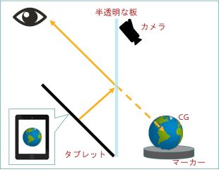 仕組みは非常にシンプルで、学校の理科で習う鏡の反射と見える像の関係が使われています(下図参照)。ただし鏡に相当する部分は透明な板なので、向こうが透けて見えて現実空間にCGが存在するように見えるという仕組みです。