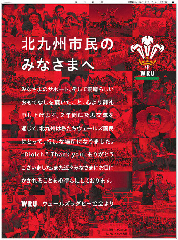同窓会の参加の為に、北九州市へ。ちょうど毎日新聞の下記の広告を拝見しました。小倉駅は祇園太鼓のモニュメントやポスターやらいたるところにウエールズ代表のユニフォームが💛パブリックビューやファンゾーンも賑わっていて、北九州市全体で盛り上がってる様子が伝わってきましたよ。