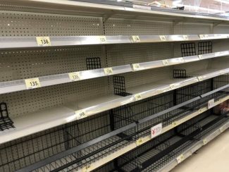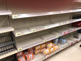 近所のスーパーに買い物に出かけたところ、インスタント麺、菓子パン、水のペットボトル等がほとんど売り切れになっていました。