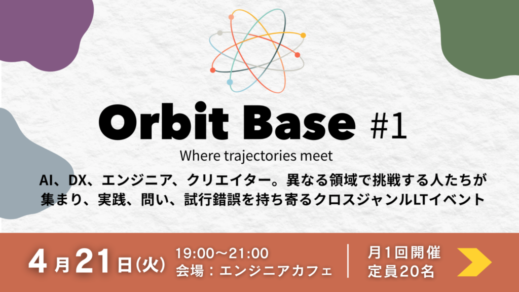 Orbit Base(オービットベース)とは、AI、DX、スタートアップ、エンジニア、クリエイターなど いろんな分野で挑戦している人たちが、 ゆるく集まって話すLTイベントです。