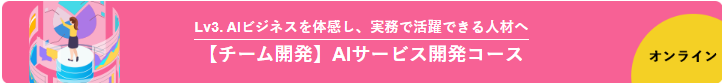 チームでAIサービス開発を実践する中級者向けの研修です。事前にEラーニングを用いて要件定義のノウハウを学び、1チーム3~5名のプロジェクトチームでAI開発の一連の流れを体験することで、実務で直接活きるスキルを身に着けます。